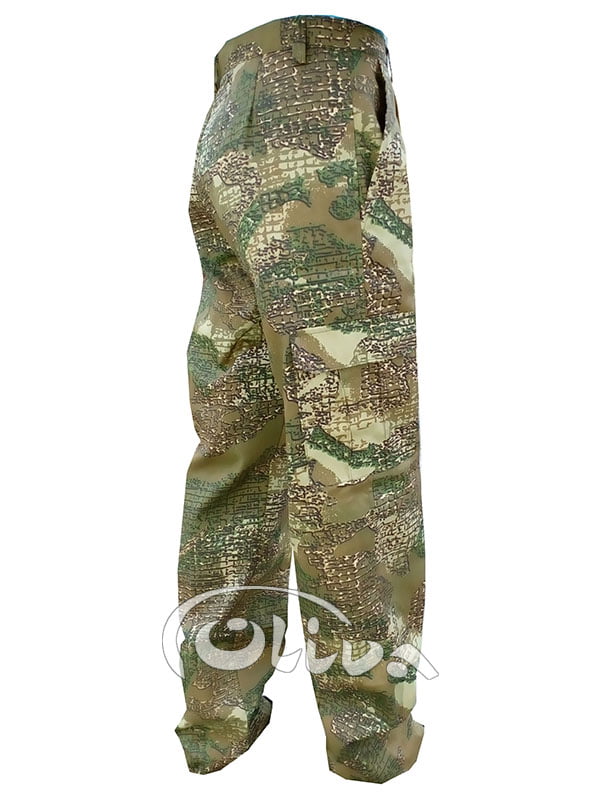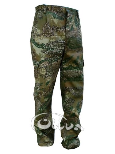 Штани вільного покрою з поясом під ремінь, гульфік на ґудзиках, мають дві бокові врізні кишені на бедрах і дві накладні кишені з клапанами на липучках в районі колін.