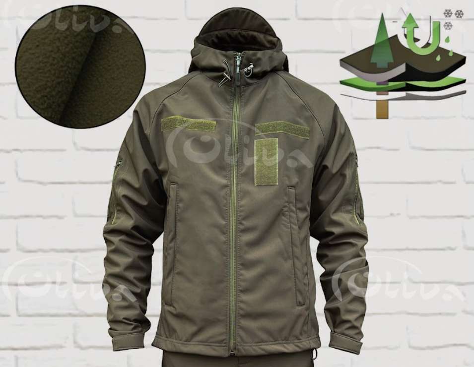 Куртка пошита з тканини (Softshell) з мембраною. Верхній шар матеріалу не дає проникати волозі всередину. Верх із мембранного поліестеру захищає від холоду, поривистого вітру та дощу а внутрішня  – регулює віддачу тепла і випарювань тіла.