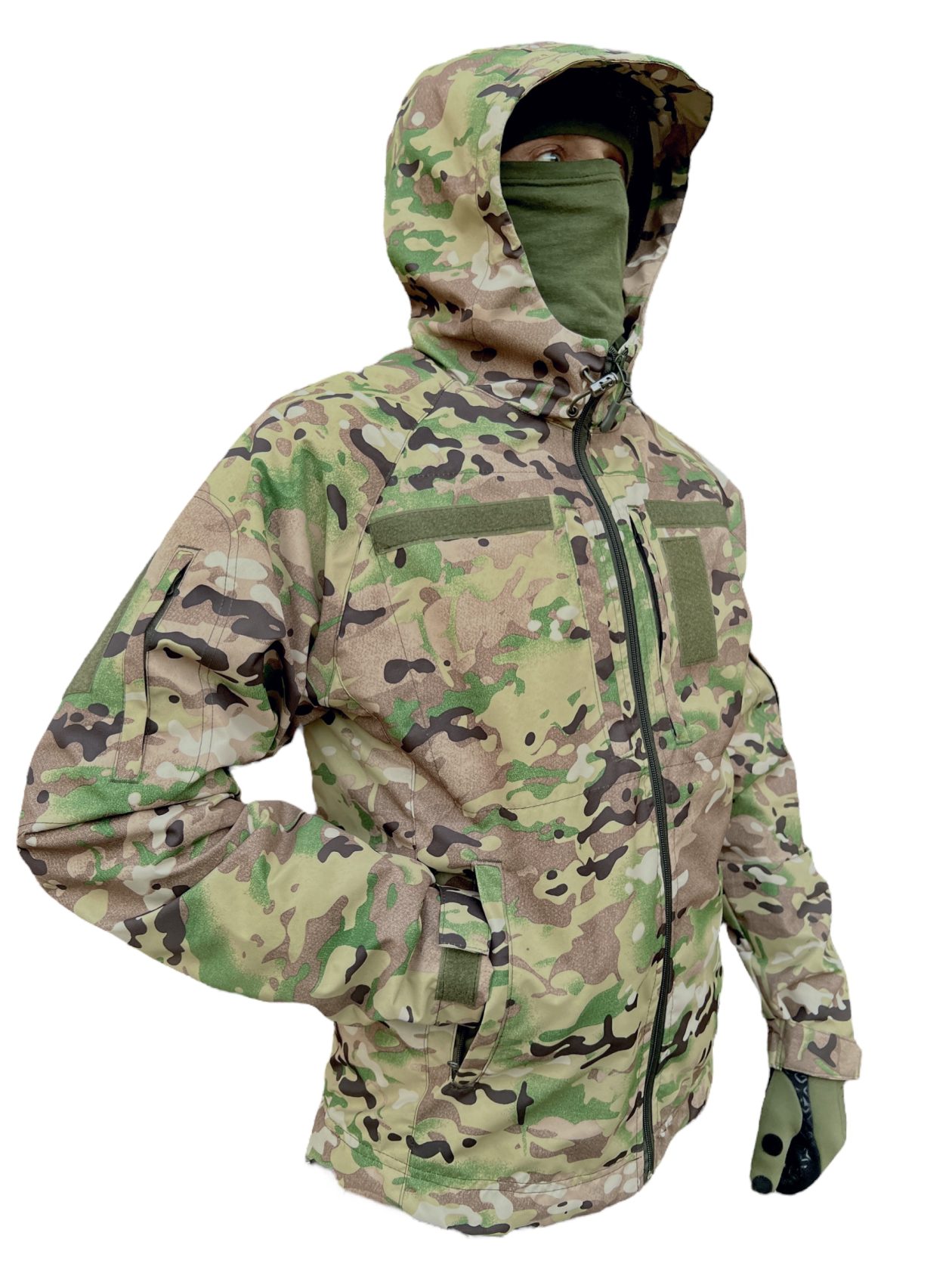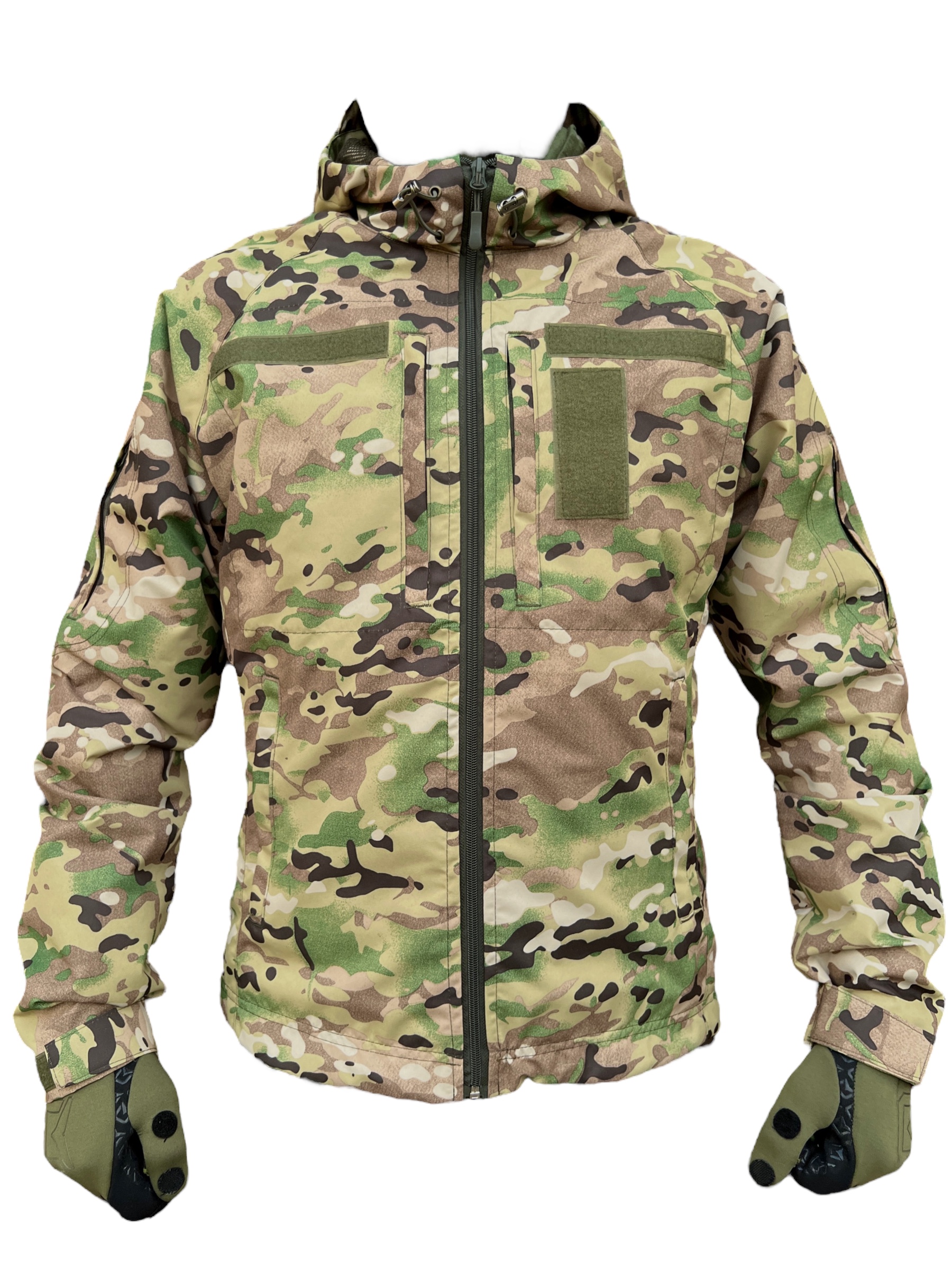 Водовідштовхуюча тактична куртка має сучасний дизайн і забарвлення з піксельним малюнком, що надає візуальну захисну функцію.