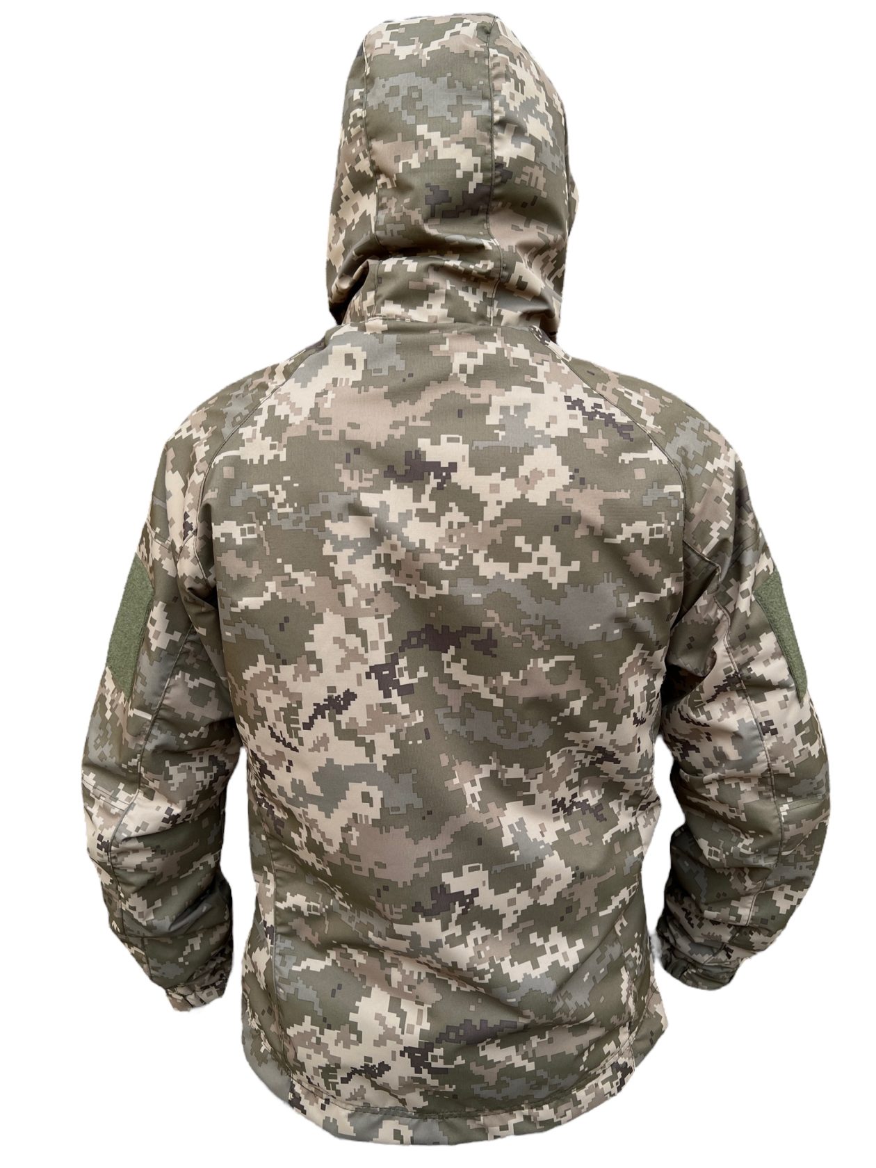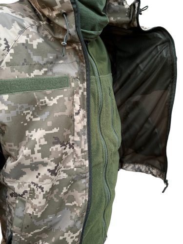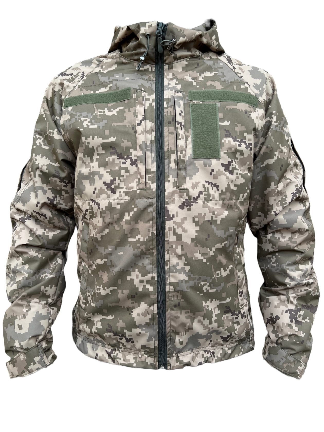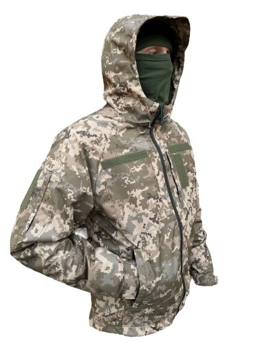 Водовідштовхуюча тактична куртка має сучасний дизайн і забарвлення з піксельним малюнком, що надає візуальну захисну функцію.