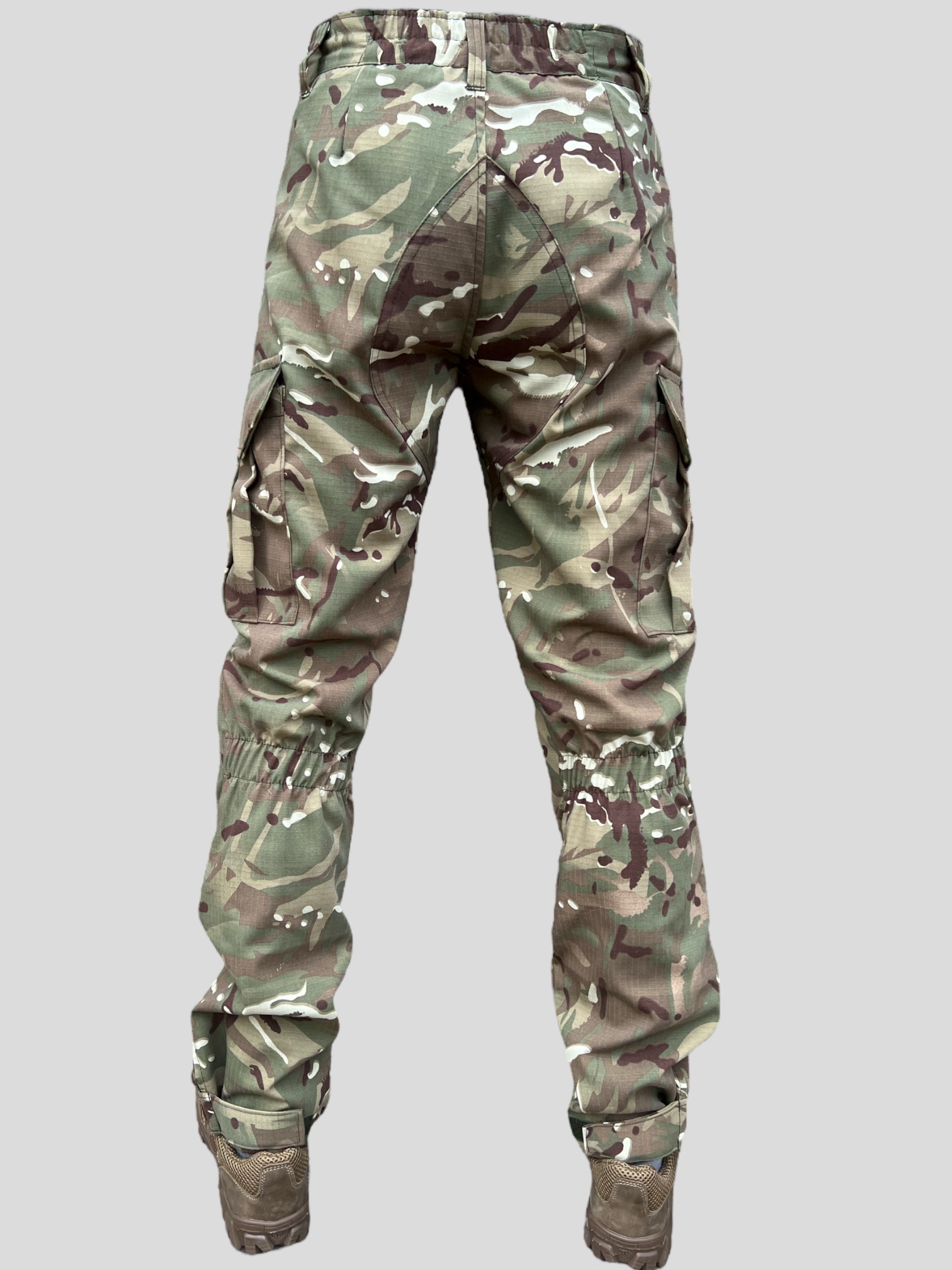 Штани вільного покрою з поясом під ремінь, гульфік на змійці, мають 4 кишені: дві бокові врізні кишені на бедрах , дві накладні кишені з клапанами на липучках в районі колін. Посилення в задній частині пошите в два шари тканини, для більшої міцності та зносостійкості. Під колінами мають стяжки на основі резино-тканинного тасьми. Низ штанів з регулюючим клапаном на липучці..