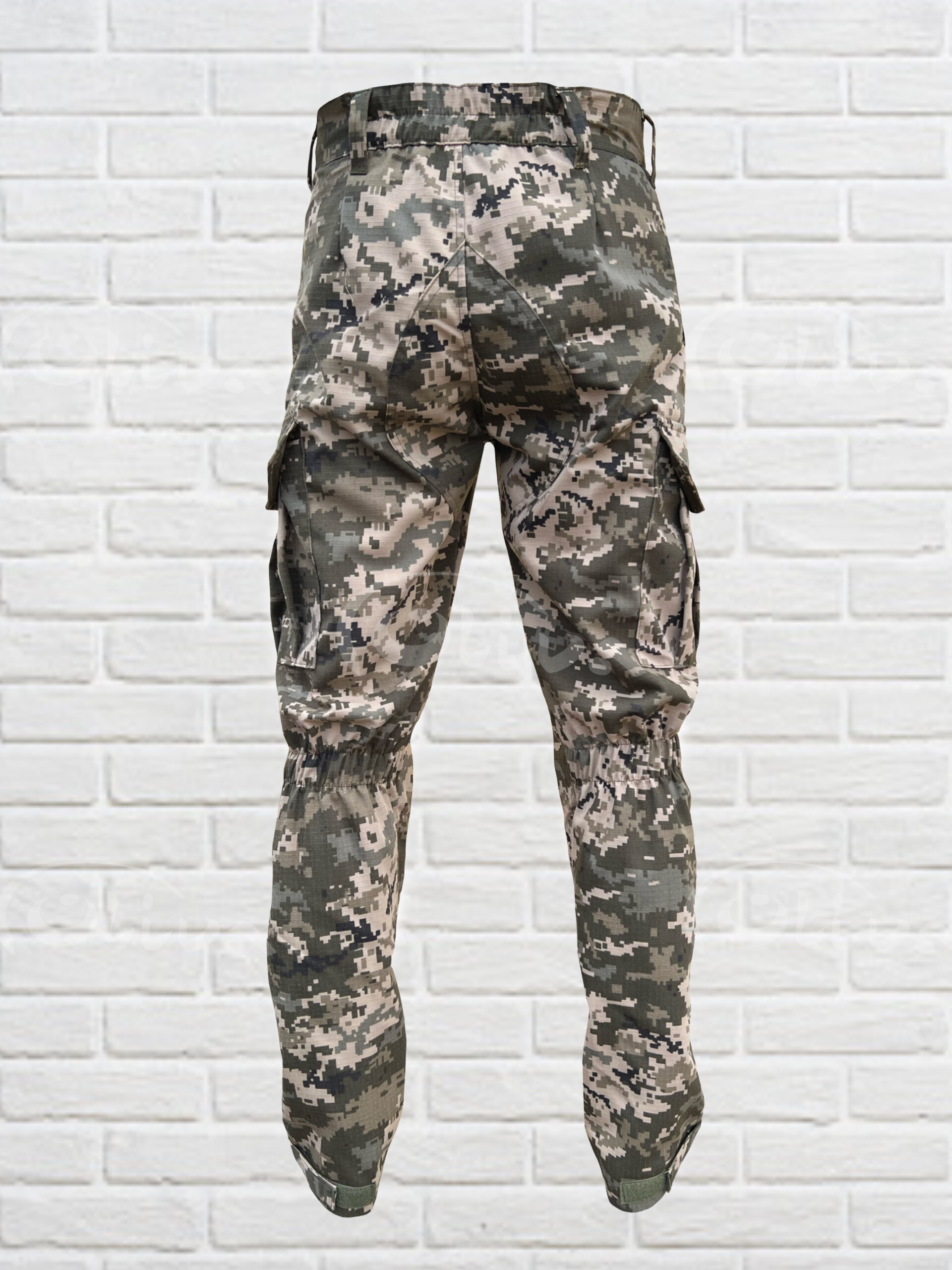 Штани вільного покрою з поясом під ремінь, гульфік на змійці, мають 4 кишені: дві бокові врізні кишені на бедрах , дві накладні кишені з клапанами на липучках в районі колін. Посилення в задній частині пошите в два шари тканини, для більшої міцності та зносостійкості. Під колінами мають стяжки на основі резино-тканинного тасьми. Низ штанів з регулюючим клапаном на липучці.