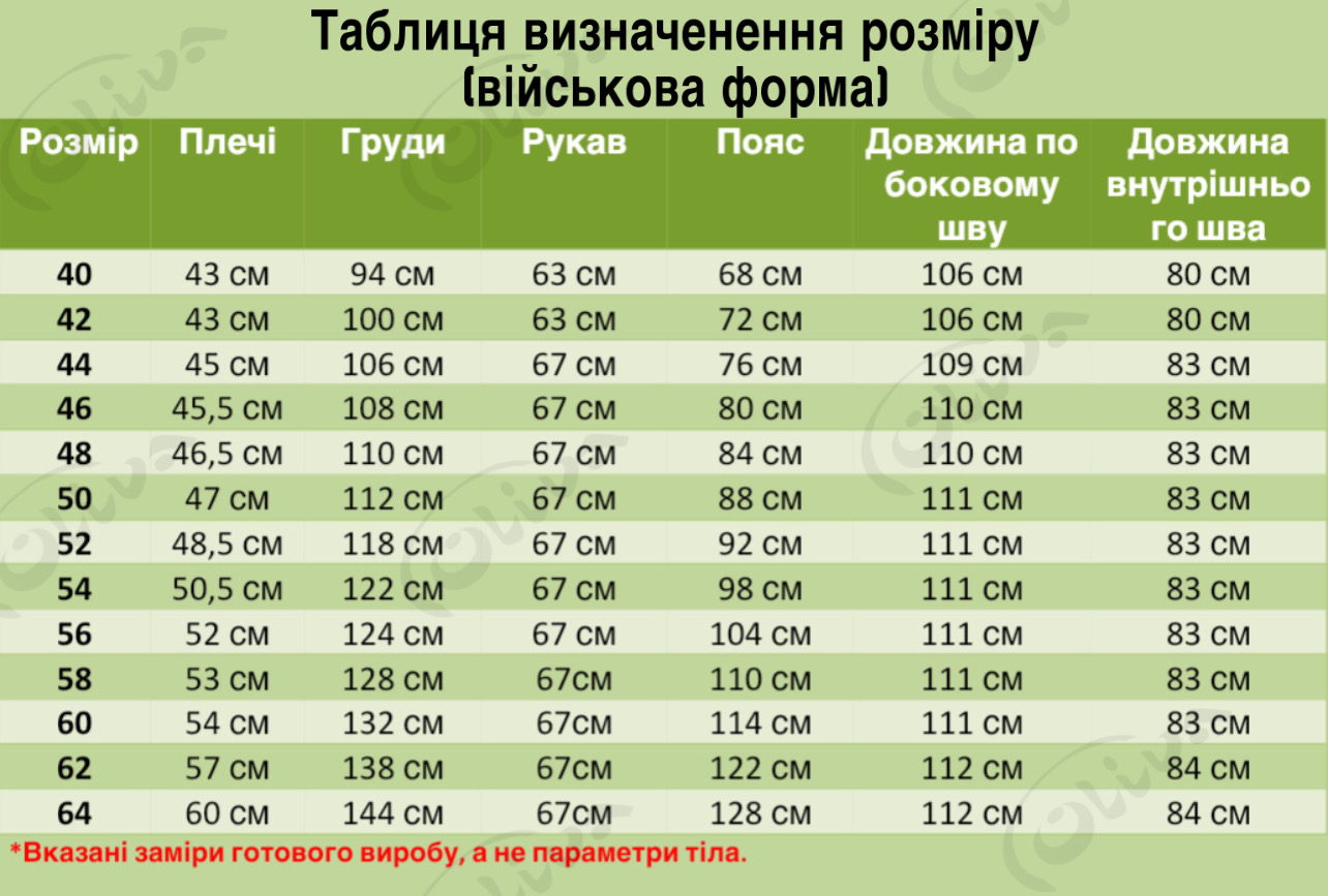 Військова форма пошита з якісної тканини – 65% хб / 35% поліестер, 245г/м, з вітро – водозахисними властивостями. Не плавиться.
